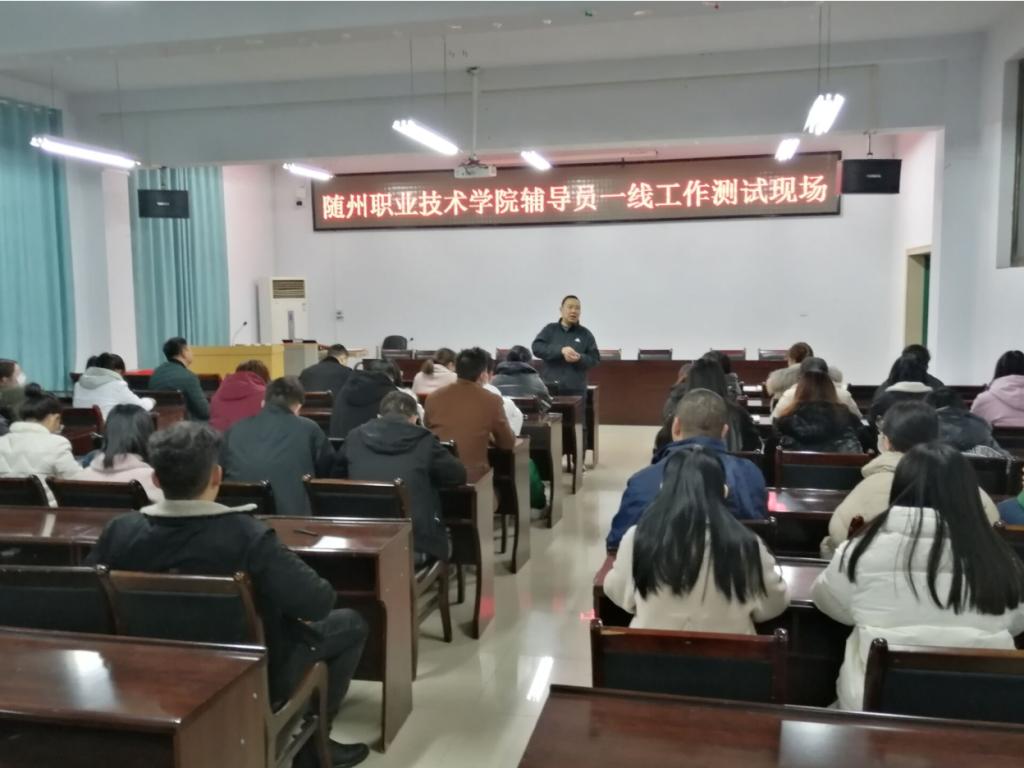根据省教育厅思政处统一要求,12月8日下午,学校学生工作处组织全院50余名专兼职辅导员在思成楼1220室进行一线工作测试,测试采用纸质闭卷形式。