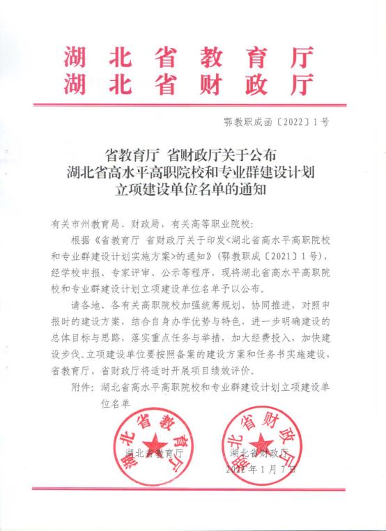2022年1月7日,湖北省教育厅、湖北省财政厅发布《关于公布湖北省高水平高职院校和专业群建设计划立项建设单位名单的通知》(鄂教职成函〔2022〕1号),beat365在线唯一官网以汽车制造与试验技术为核心龙头的专用汽车制造专业群获批湖北省高水平专业群A类立项建设项目,标志着beat365专业建设综合水平再上新台阶。