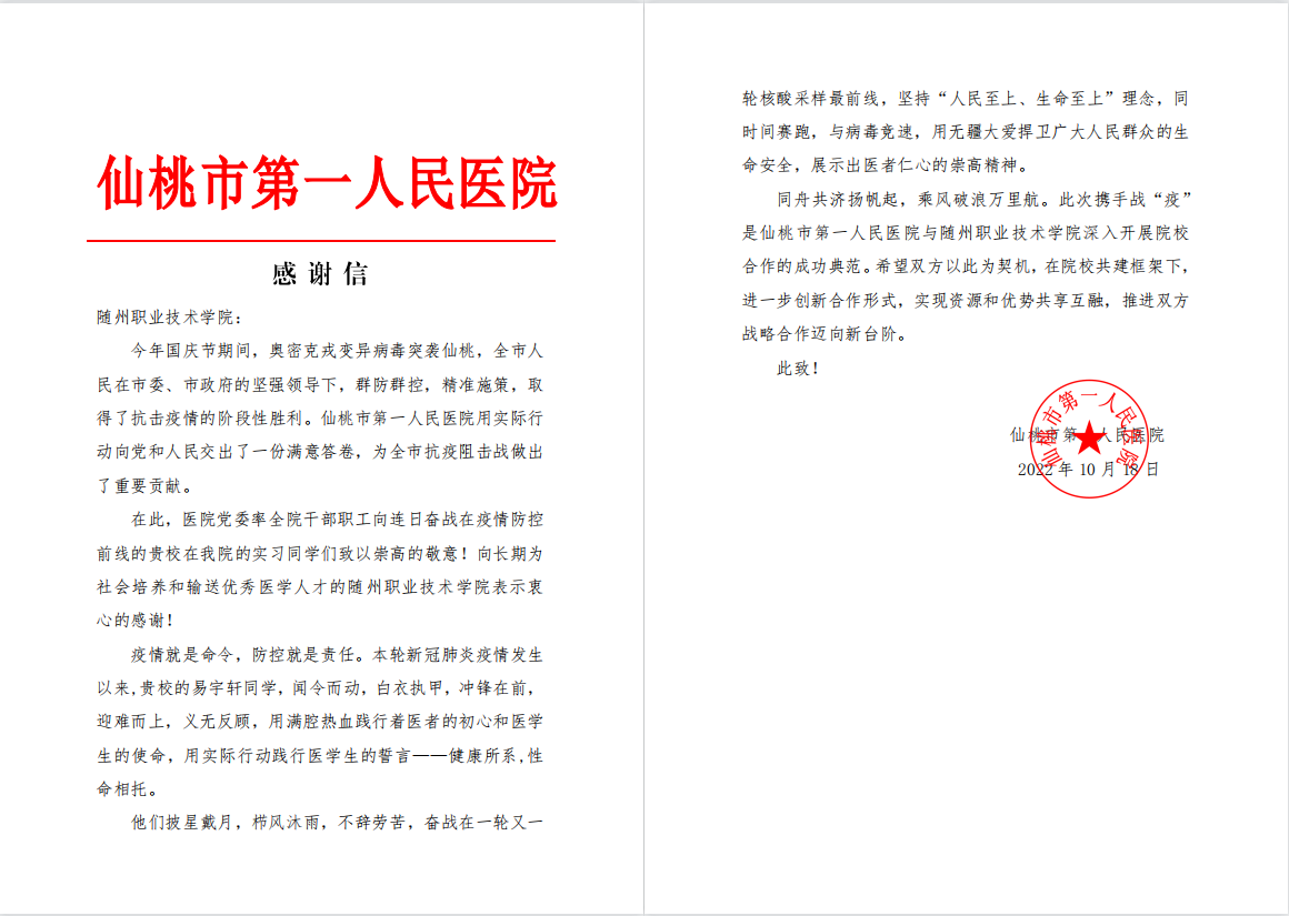 近日,beat365收到仙桃市第一人民医院的一封感谢信,信中对奋战在疫情防控前线的beat365医学院2020级临床1班的易宇轩同学表达了感谢,同时向长期为社会培养和输送优秀医学人才的beat365在线唯一官网表示衷心的感谢!