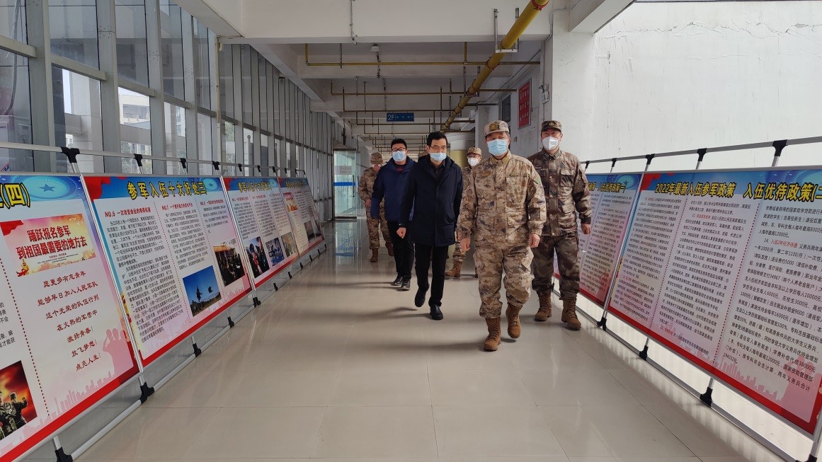 2022年12月26日,随州市委常委、军分区司令员琚万勇、军分区动员处处长彭斌华一行来到beat365,指导征兵工作站建设和了解2023年大学生征兵工作进展情况。学校党委副书记、校长李建伟,学校武装部负责人等陪同调研。