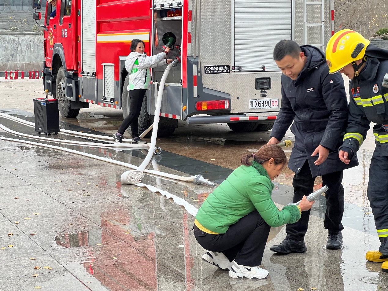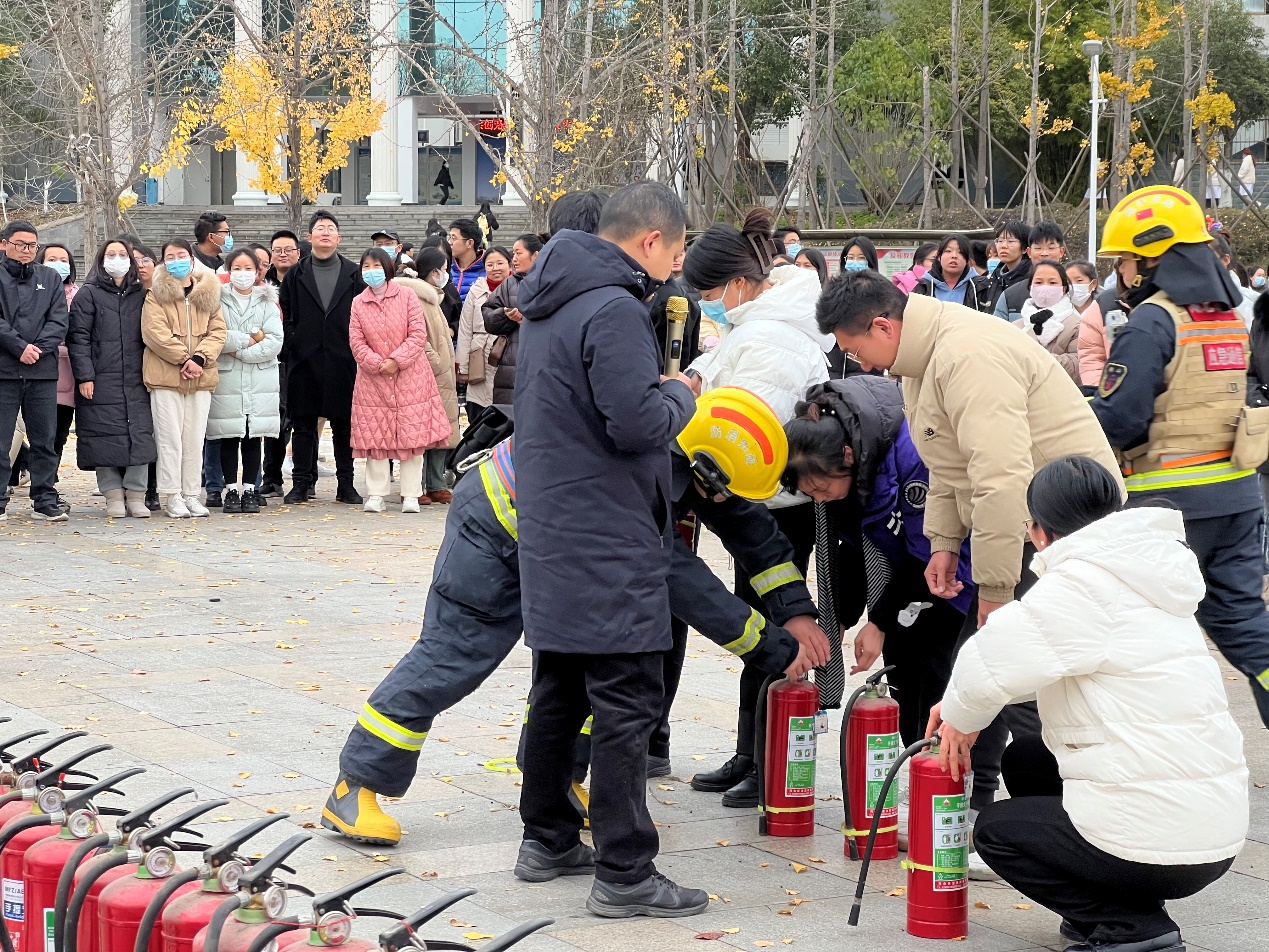 在消防知识科普环节中随州市消防救援支队消防员在现场给师生普及消防知识,同时开展师生使用灭火器以及高压水枪“灭火”的体验活动。全体辅导员、保安人员、宿舍管理人员以及新进教职工参与了实操训练。