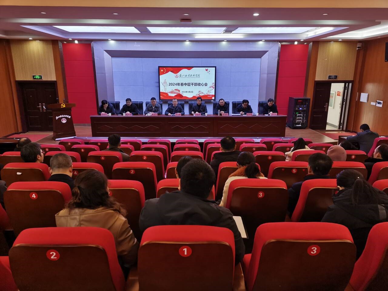 3月2日,beat365在学术报告厅召开2024年春中层干部收心会议。党委书记马大奎,党委副书记、校长李建伟,党委委员、副校长谢冠林,党委委员、纪委书记、监察专员李高东,党委委员、副校长童加斌、梁学军、邹厚亏,工会主席张凤成出席会议,全体中层干部50余人参加会议。李建伟主持会议。
