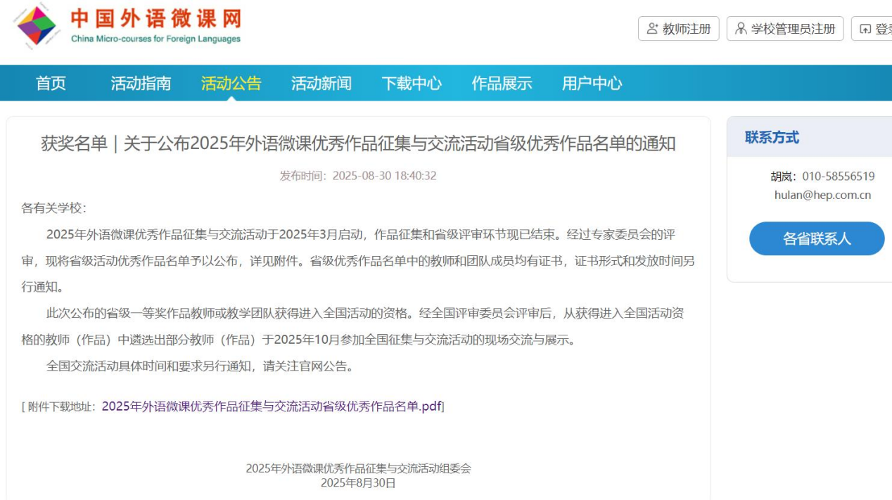 本次大赛于2025年3月启动,涵盖本科英语、高职英语和多语种三个赛道,采用多省合组评审方式。在包含广东省、甘肃省、黑龙江省、山东省、湖北省、湖南省、内蒙古自治区和上海市等八省市的小组评审中,共评出一等奖6名、二等奖10名、三等奖13名。