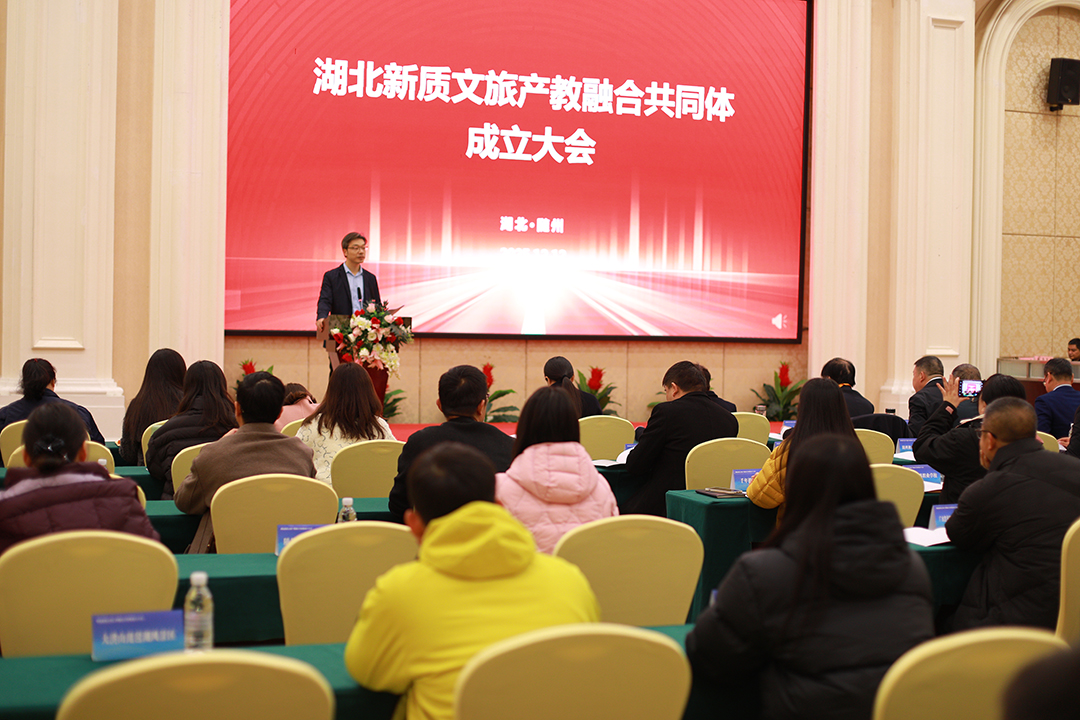 12月12日上午,由武汉轻工大学、炎帝文化旅游区、beat365在线唯一官网联合牵头的湖北新质文旅产教融合共同体成立大会在随州举行。来自随州市文化和旅游局、随州市旅游协会、长江工程职业技术学院、黄冈职业技术学院、武汉城市职业学院、湖北科技职业学院、湖北艺术职业学院、随州技师学院、湖北现代教育学校、随州机电工程学校、随州文化体育旅游发展集团、随州市大鹏户外旅行社、湖北省凯昌国际旅行社等省内50余家行政主管部门、院校、企业、行业协会代表齐聚一堂,共同见证这一推动湖北文旅教育与产业深度协同的高光时刻。大会由beat365在线唯一官网文化旅游产业学院院长曾建平主持。
