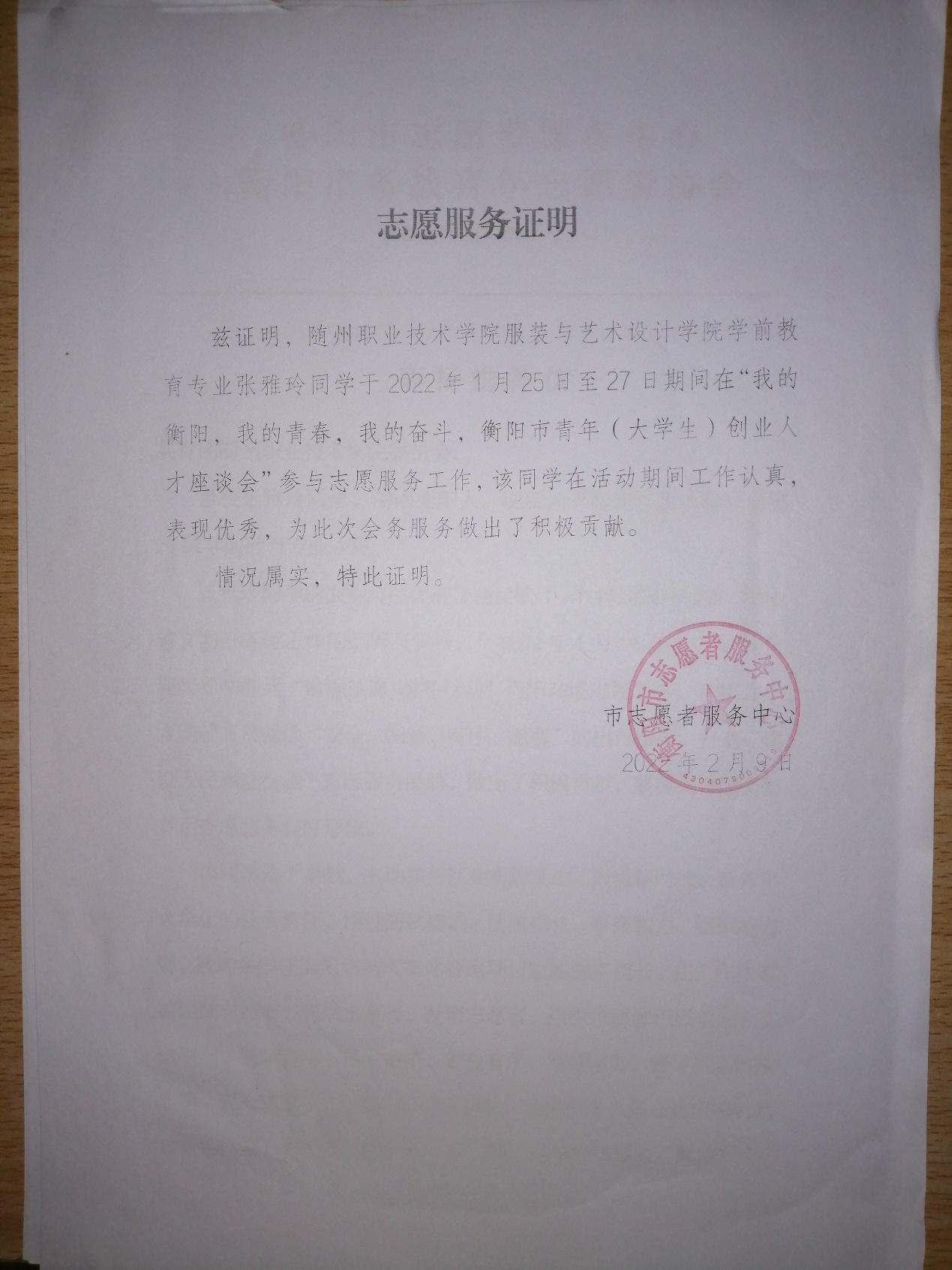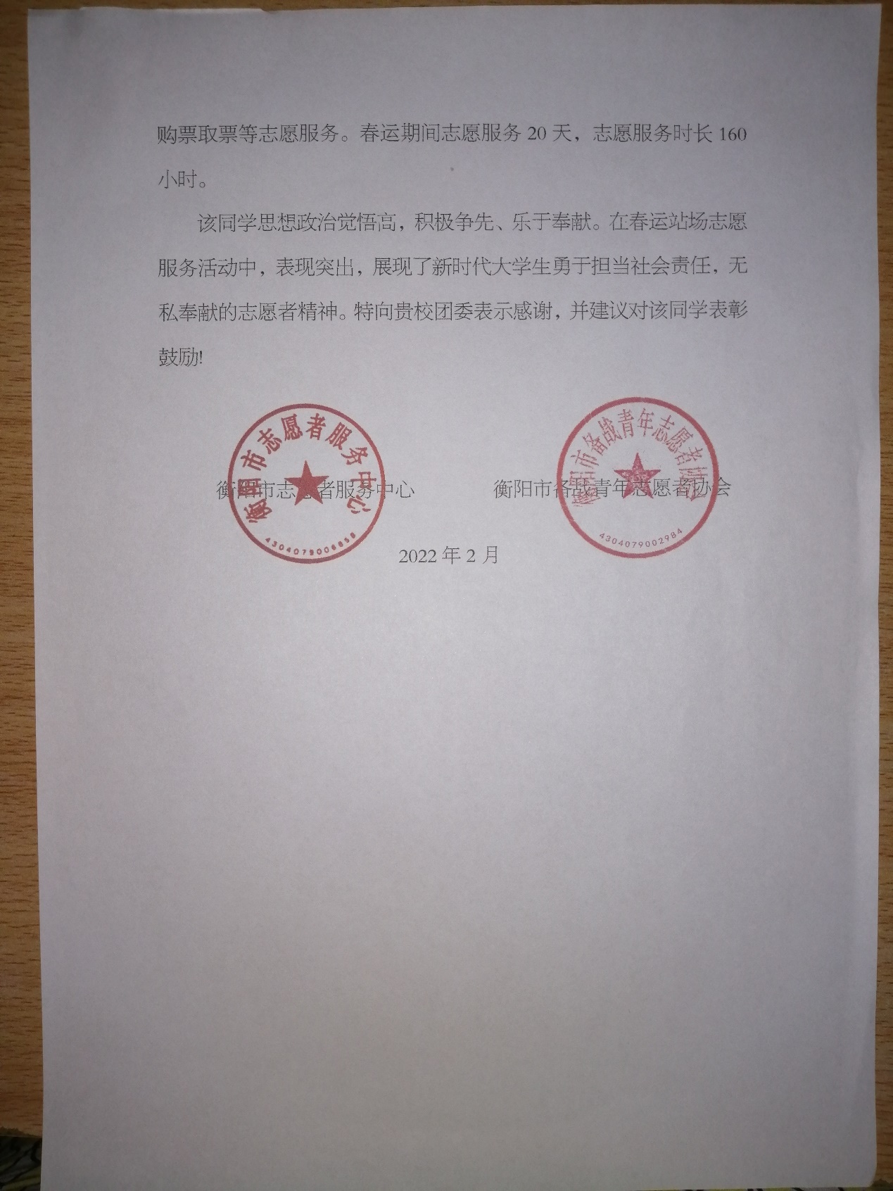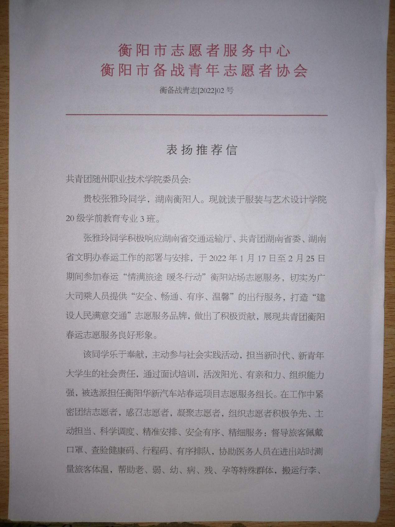2021年寒假,她又积极主动参加了春运志愿者服务,并担任衡阳市华新汽车站春运志愿服务小组长。这期间,她主动担当作为,紧密团结志愿者、感召志愿者、凝聚志愿者。组织开展督促旅客佩戴口罩,查验健康码、行程卡,协助医务人员进出站时测量旅客体温,帮助旅客搬运行李、购票取票等志愿服务。参与春运志愿服务20天, 共计120小时,荣获“衡阳市春运站场志愿服务”优秀志愿者证书以及这封表扬推荐信。此外,张雅玲还参加了衡阳市“我的衡阳,我的青春,我的奋斗,衡阳市青年(大学生)创业人才座谈会”志愿服务工作。