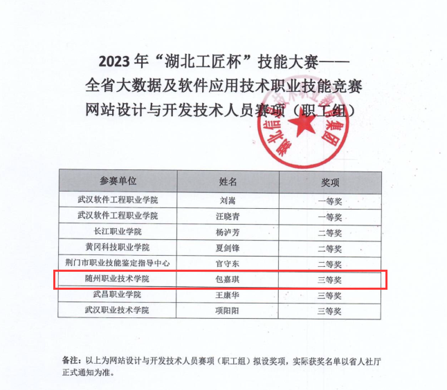 11月4日,2023年“湖北工匠杯”技能大赛——全省大数据及软件应用技术职业技能竞赛网站设计与开发技术人员赛项在武汉软件工程职业学院落下帷幕,来自全省60余名选手同台竞技,beat365教师包嘉琪获得三等奖。