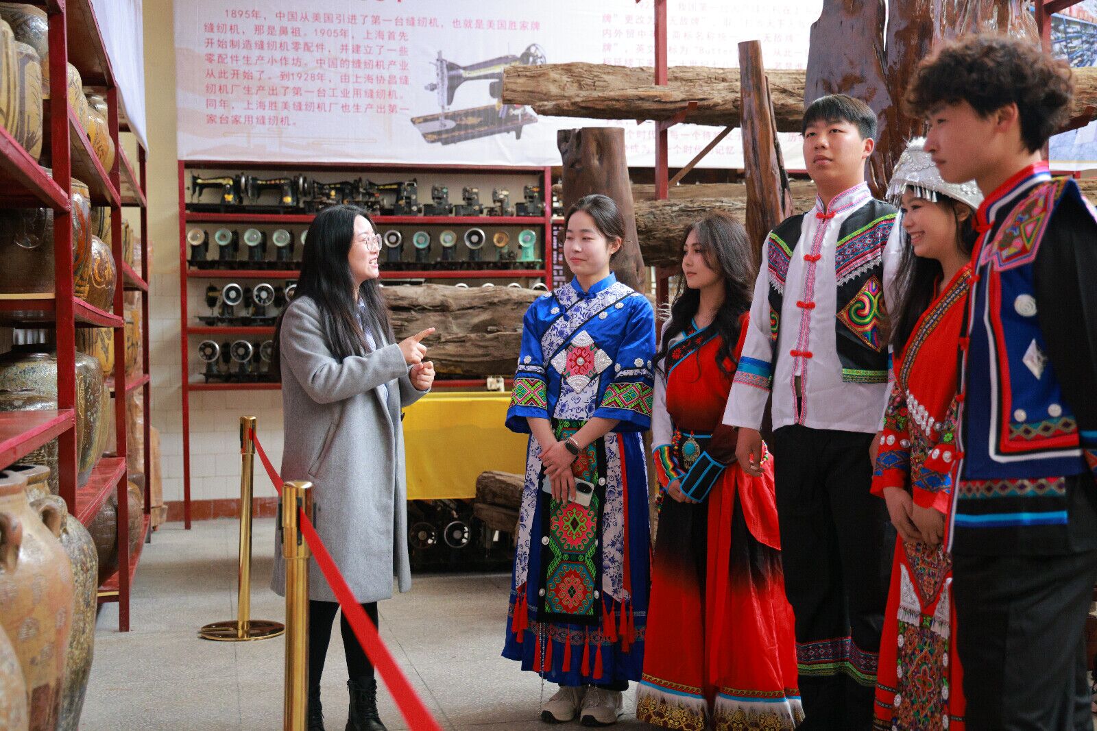 活动中,“玉见·红石榴”工作室老师肖新俊、董惠玉、李思玉、刘景玉以馆藏文物为载体,现场开设“行走的思政课”。通过解析炎帝神农“始作耒耜,教民耕种”“治麻为布,制作衣着”“作陶为器,冶制斤斧”“台榭而居,安居乐业”的开拓创新精神,让在场的各民族同学们深刻理解“中华民族一家亲”的历史根基。2024级维吾尔族学生努尔斯曼古丽•热夏提在观赏传统纺织机时表示:“无论是维吾尔族的艾德莱斯绸,还是汉族的桑蚕丝,都凝聚着中华民族的智慧。我们应像石榴籽一样紧紧抱在一起,共同守护文化根脉。”