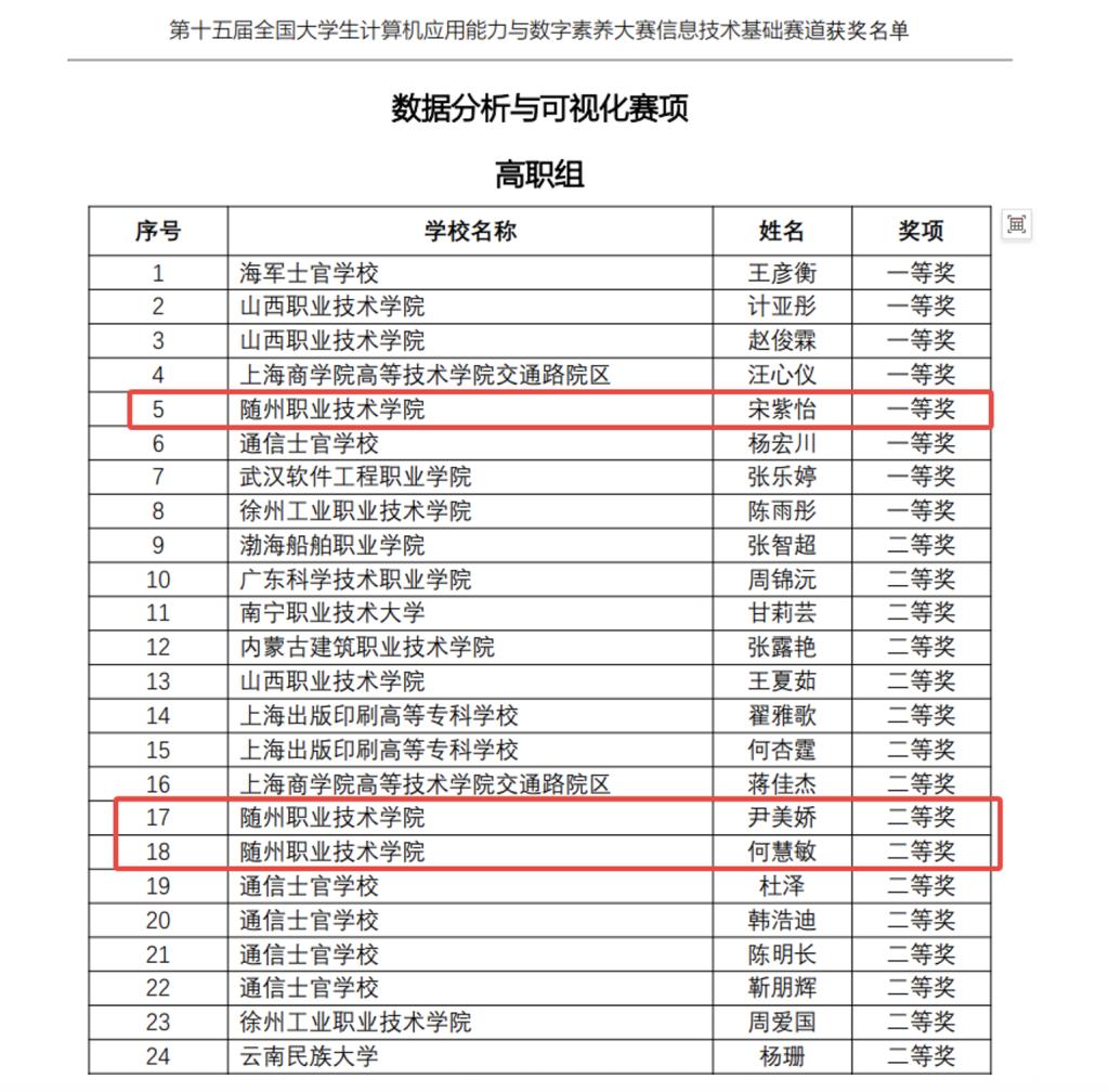 第十五届全国大学生计算机应用能力与数字素养大赛全国总决赛于5月24日举行,信息工程学院五名同学在数据分析与可视化赛项区域赛中获得一等奖成功晋级全国总决赛,在全国总决赛中宋紫怡获得一等奖,尹美娇、何慧敏获得二等奖,黄依红、董相宏获得三等奖。