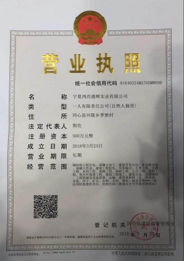 2018年三月自己创办(宁夏鸿亮德辉实业有限公司)是一家建筑工程施工及机械租赁.土石方工程为一体的一家有限责任公司,到2021年10月我公司有装载机5台,挖机2台,大小车辆6辆。公司资产1500多万,近三年为国家纳税200多万,从小微企业转变成一般纳税人。