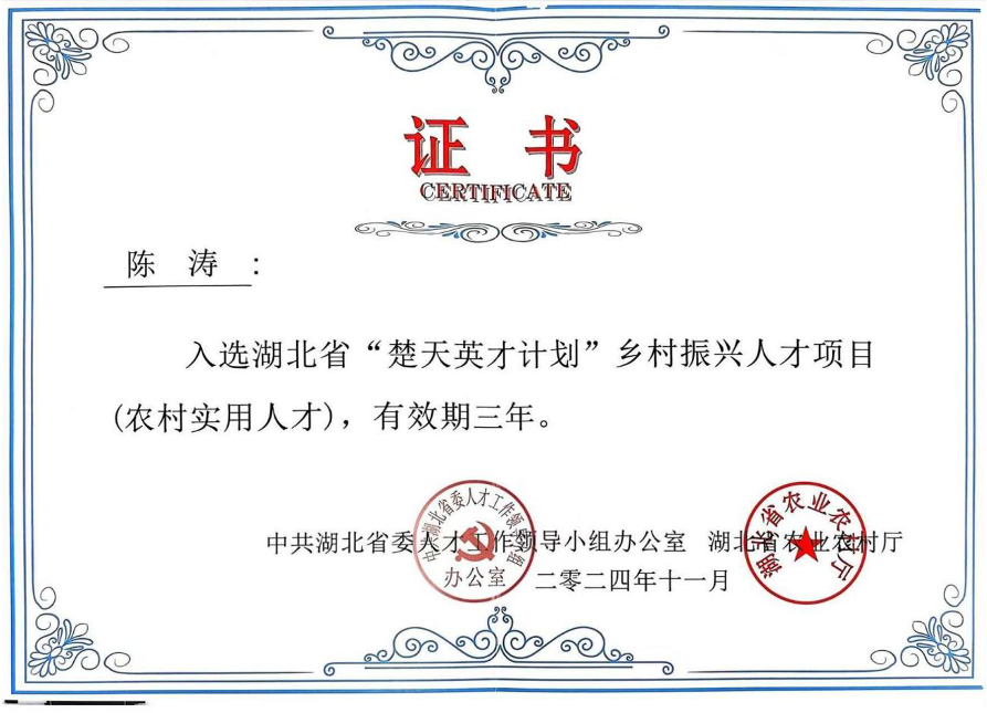该项目在2024年11月获得“湖北省农村实用人才创新创业项目大赛”三等奖;并成功入选湖北省“楚天英才计划”乡村振兴人才项目(农村实用人才)。